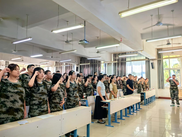 在动员讲话中,靳雪银首先强调了军训的核心价值,指出本次军训不仅是体能和技能的锻炼,更是一堂直击心灵的国防教育课,是落实全民国防教育、培育新时代青年国防意识的重要载体。新生通过军训掌握基本军事技能、熟悉国防相关知识,既是履行公民国防义务的基础要求,也是增强民族凝聚力、筑牢国家国防防线的青春担当。随后,她介绍了本次军训设置的丰富多样的活动与评比,包括军歌红歌合唱比赛、叠军被大赛、内务卫生评比、分列式阅兵评比、战地医疗救护大赛以及格斗基础科目评比等,这些活动和评比不仅是对大家训练成果的检验,更是培养大家纪律意识、协作能力和集体荣誉感的重要载体,对于厚植同学们的家国情怀、锤炼不畏艰难的意志品质,具有不可替代的作用。接着,通过展示近年来在军训工作中的突出成果和取得的优异成绩,进一步激发了新生们的集体荣誉感和争先意识,并希望2025级新生能以此为激励,迅速进入状态,以昂扬的斗志和饱满的热情投入到训练中,力争在本届军训中交出一份同样出色的答卷。会议最后,在领誓人的带领下,全体新生高举右拳,庄严宣誓。他们承诺将以钢铁般的纪律意识和坚韧不拔的毅力,严格遵守军训要求,绝对服从教官指令,全身心投入训练,以优异的成绩完成军训任务。