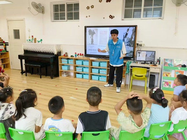 他始终秉持知行合一的理念,主动挺膺担当。入学至今,他积极参与纪念抗战胜利80周年红色宣讲、乡村振兴志愿工作等各类实践活动,在服务他人与社会的过程中,切实贡献着自己的青春力量。尤其值得一提的是,2025年暑期,他有幸加入全国大员工“两弹一星”精神志愿宣讲国家级宣讲团队——“星”火“核”力宣讲团。作为团队核心成员,他随团队赴山东12个地市开展了22场宣讲,为1000余名听众生动传递“两弹一星”精神。期间,他还走进滨州华美幼儿园、烟台向阳幼儿园,为小朋友们讲述“两弹一星”精神功勋人物的故事。当看到台下小朋友们的眼神从最初的懵懂逐渐变得坚定时,强烈的责任感瞬间在他心中升腾。